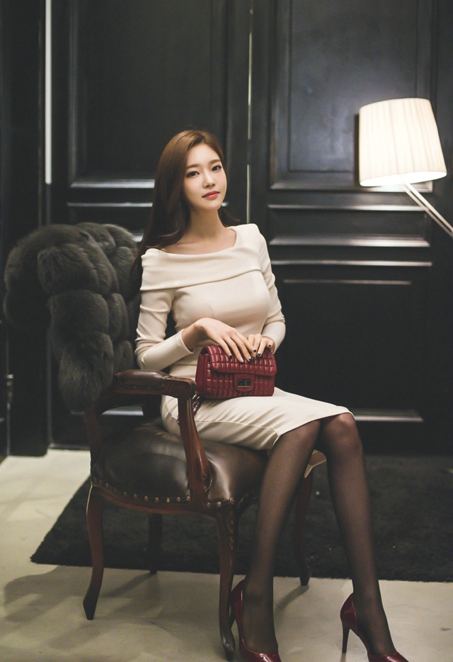 椅子美模粉嫩裙外搭皮草黑絲襪性感誘惑